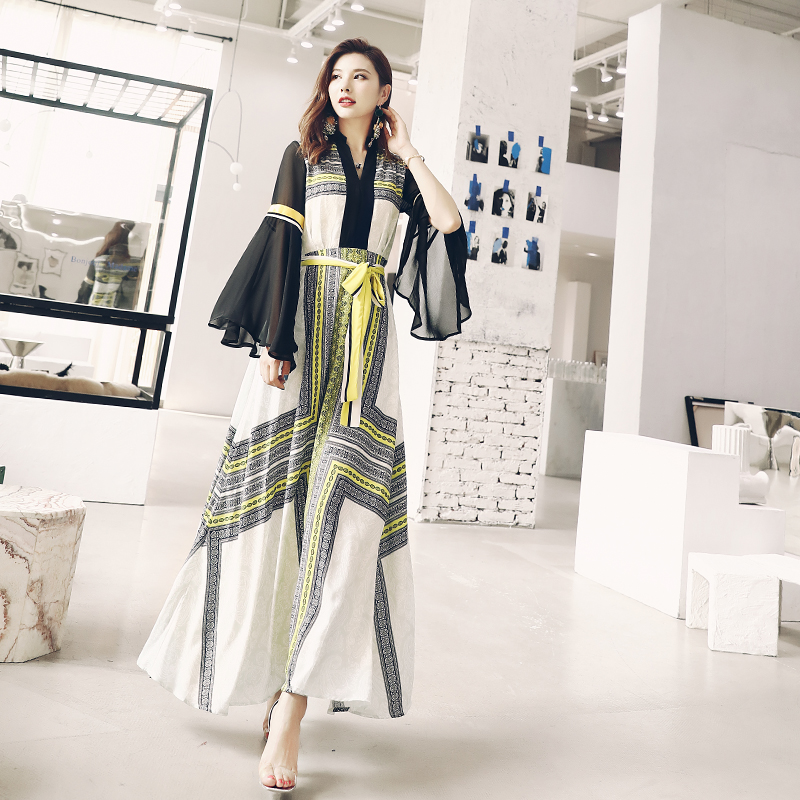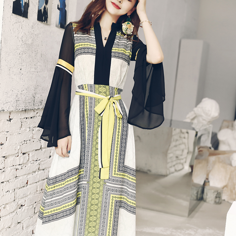 / 名媛氣質溫柔裙超仙收腰顯瘦喇叭袖復古印花長袖中長款高腰連衣裙