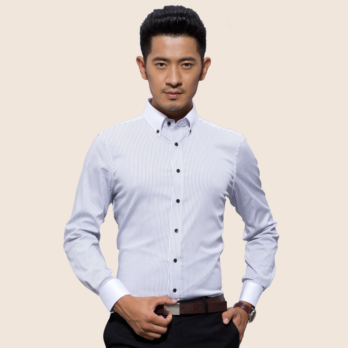 深海襯衫潮男紅色豎條紋彈力棉韓版潮牌商務休閑男士抗皺免燙襯衣