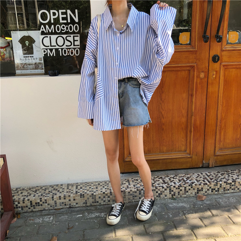 / 夏季女裝韓版BF風寬松中長款薄款條紋襯衫長袖防曬衣襯衣上衣外套