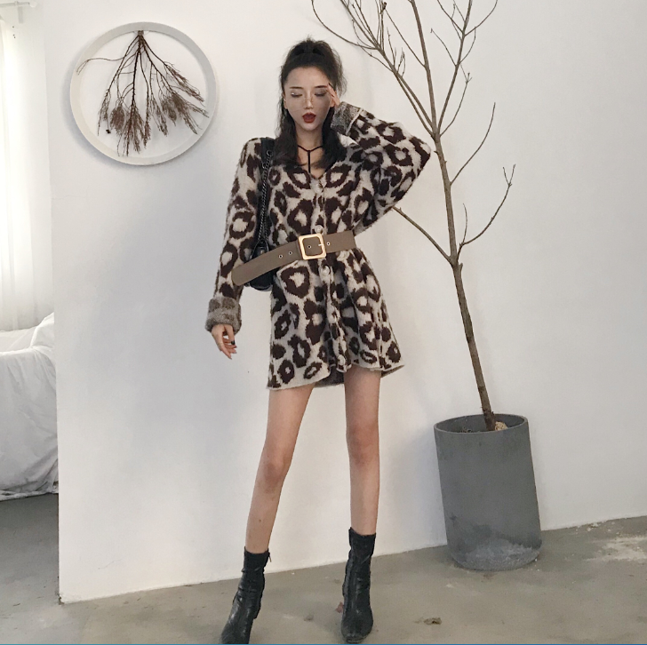 / 秋冬新款韓版加厚保暖時尚單排扣女裝豹紋網紅毛衣開衫外套配腰帶
