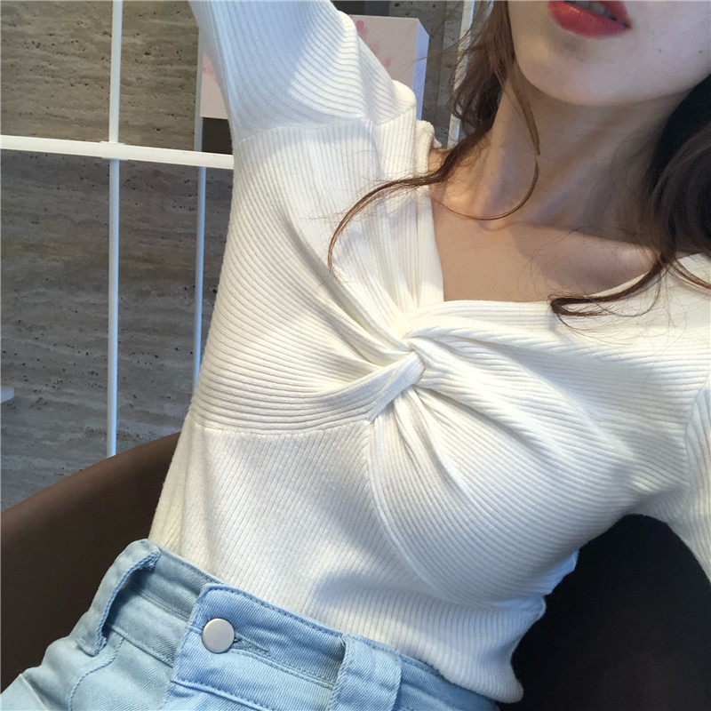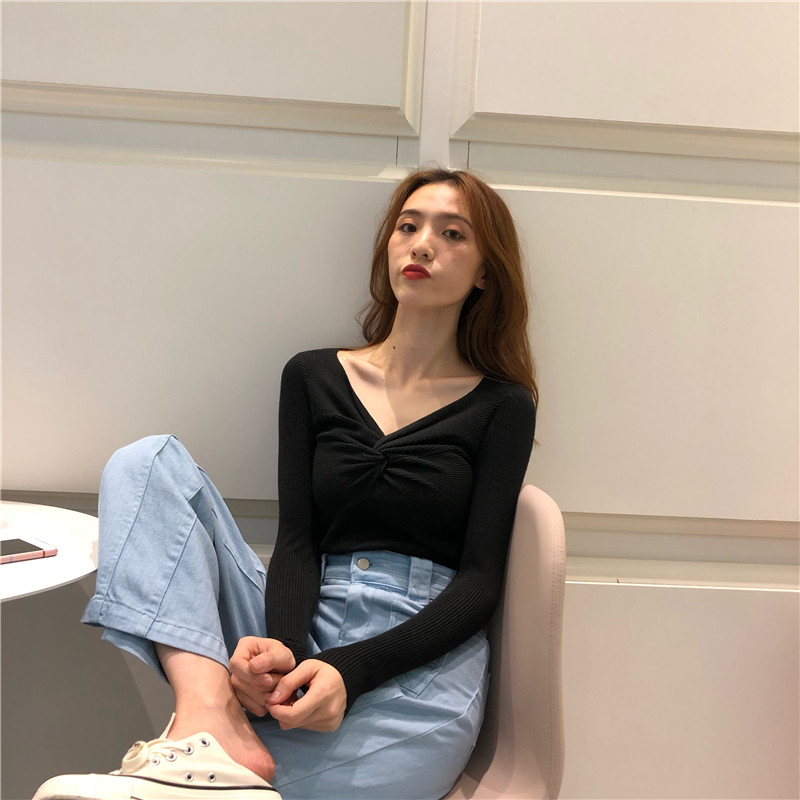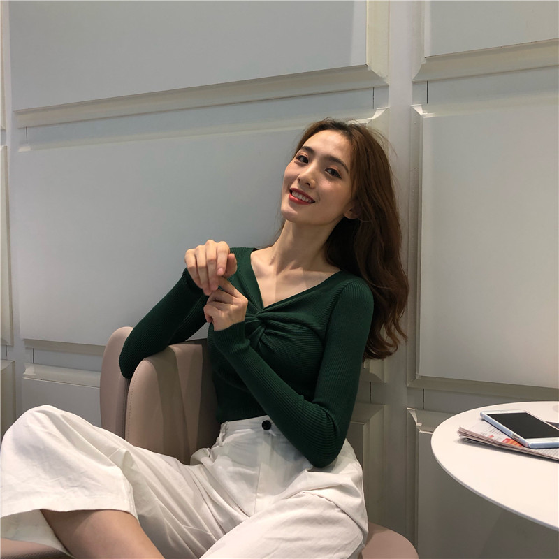 / 復古chic風早秋上衣女新款百搭純色V領交叉長袖針織衫個性打底衫