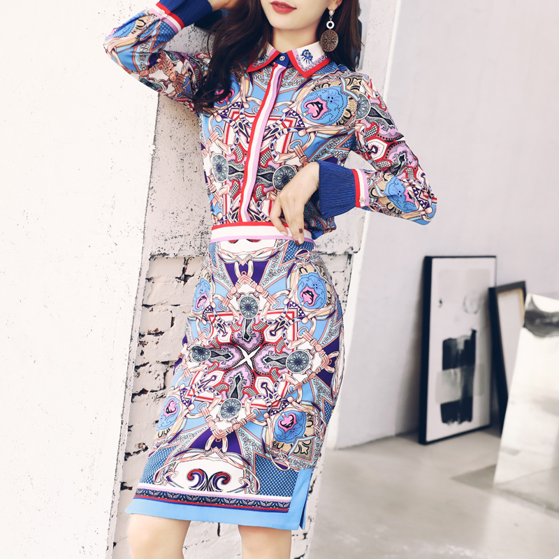 早秋裝2018新款時尚襯衫高腰印花半身裙兩件套港味成熟OL套裝女潮