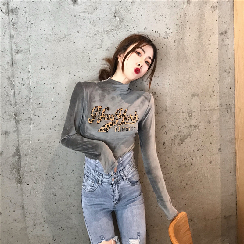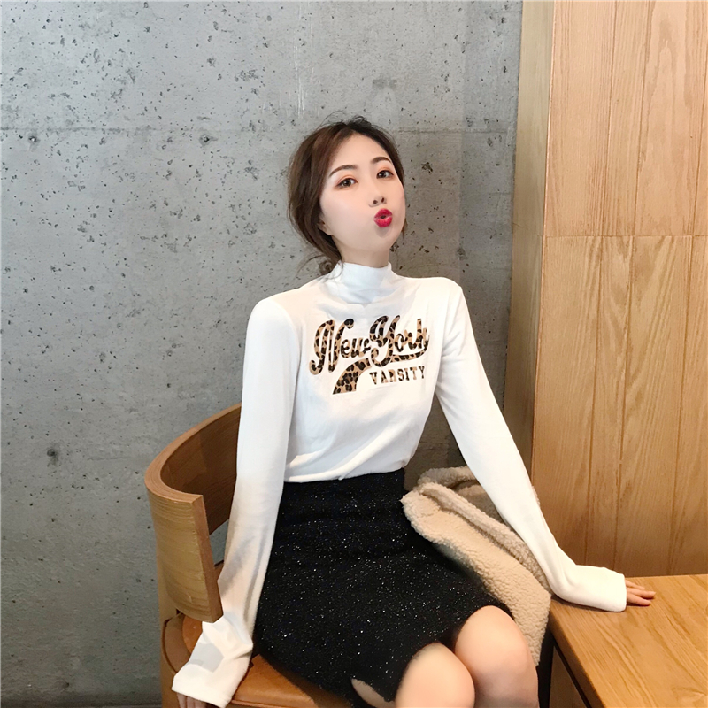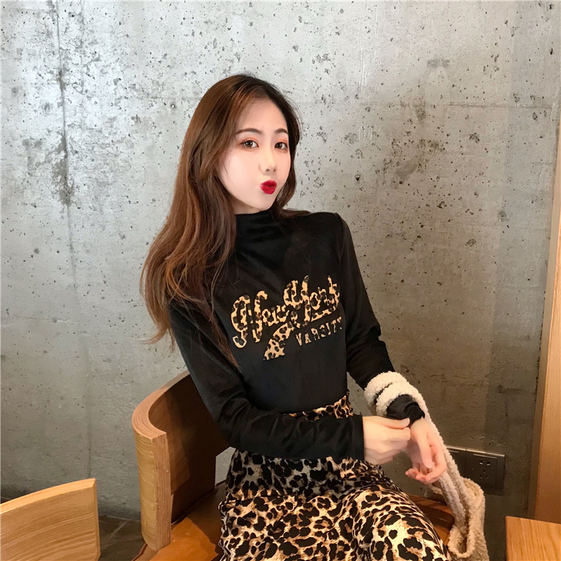 / 秋冬新款絲絨加厚高領打底衫長袖保暖豹紋字母顯瘦內搭T恤上衣女