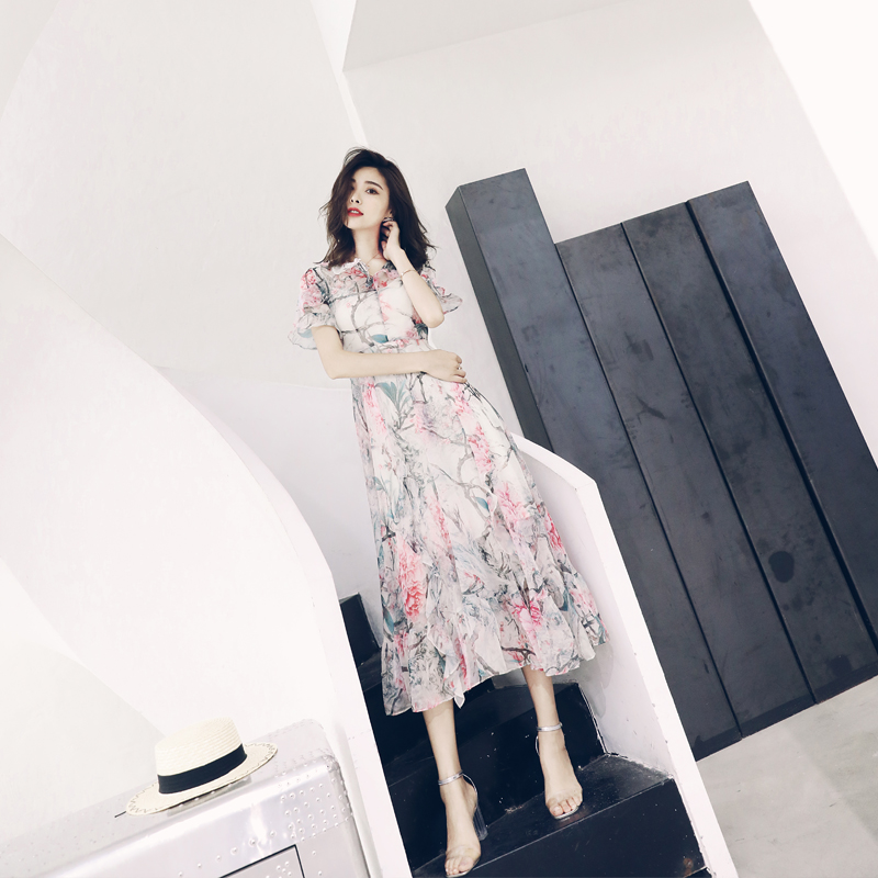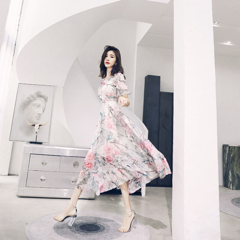 / s秀名媛氣質2018夏季新品短袖收腰顯瘦印花女神范碎花長款連衣裙