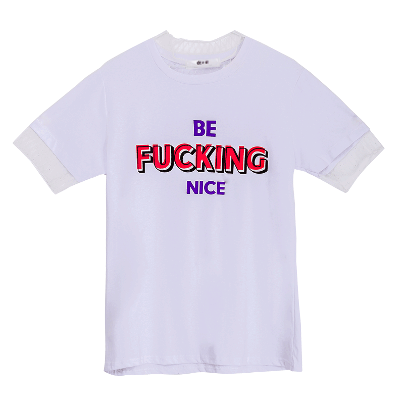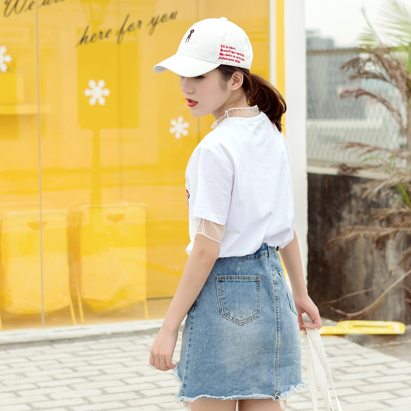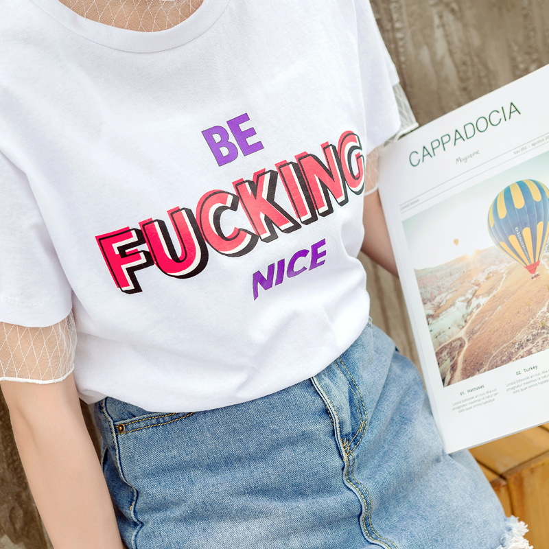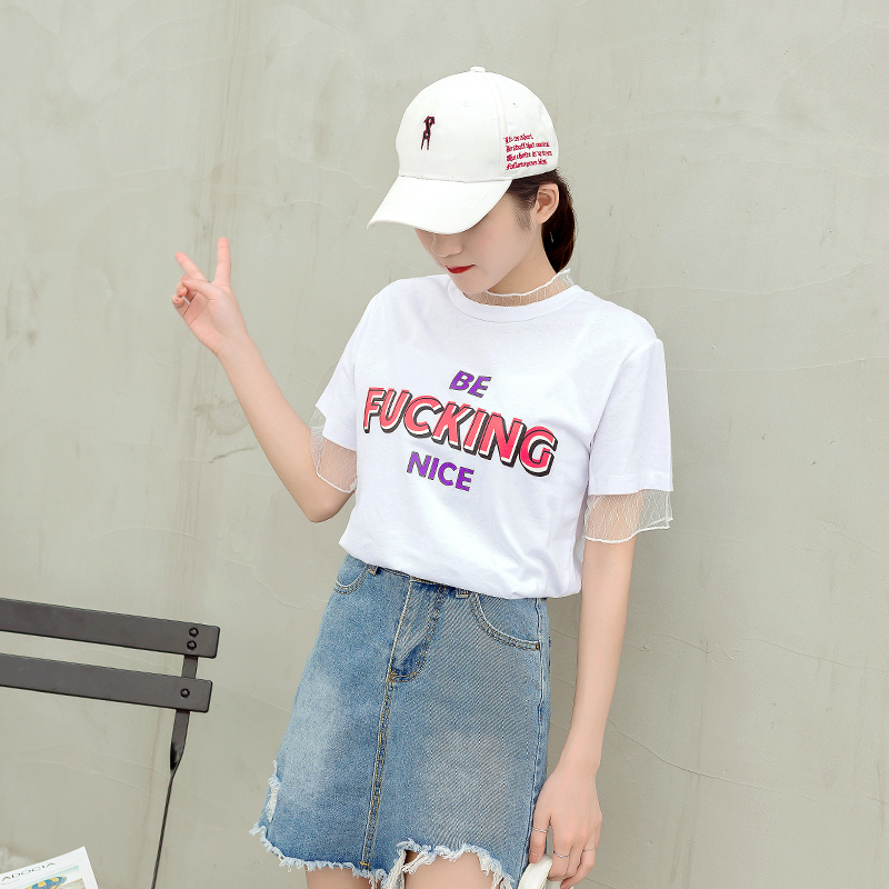 / 春夏季新款女裝韓范學生T恤圓領字母印花短袖網紗拼接上衣潮