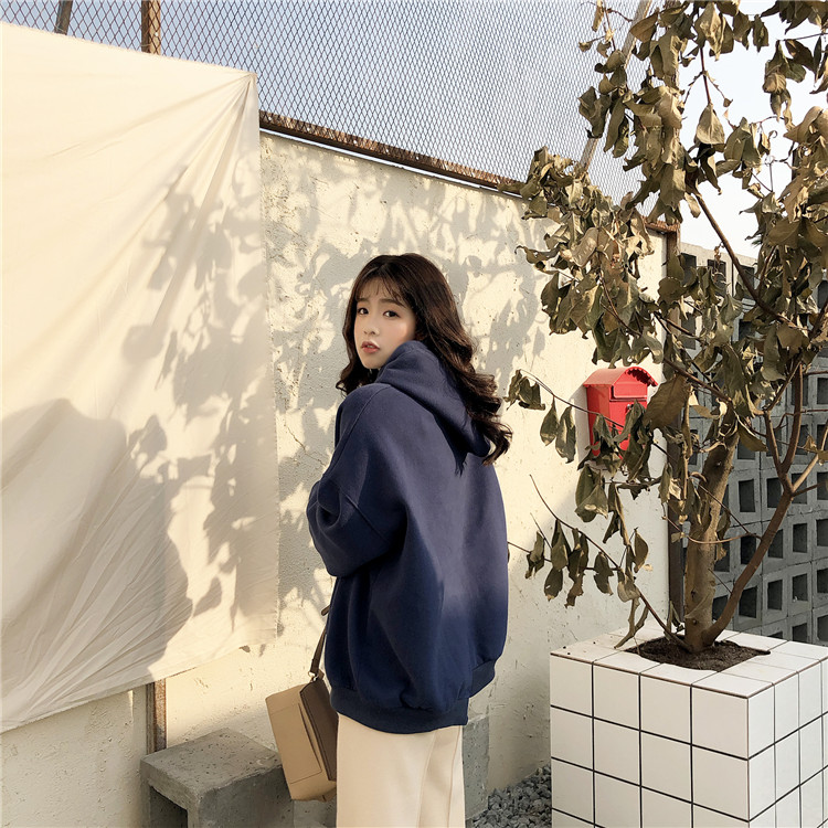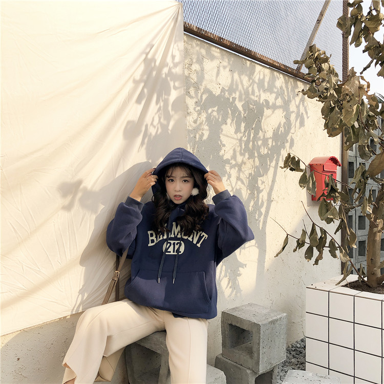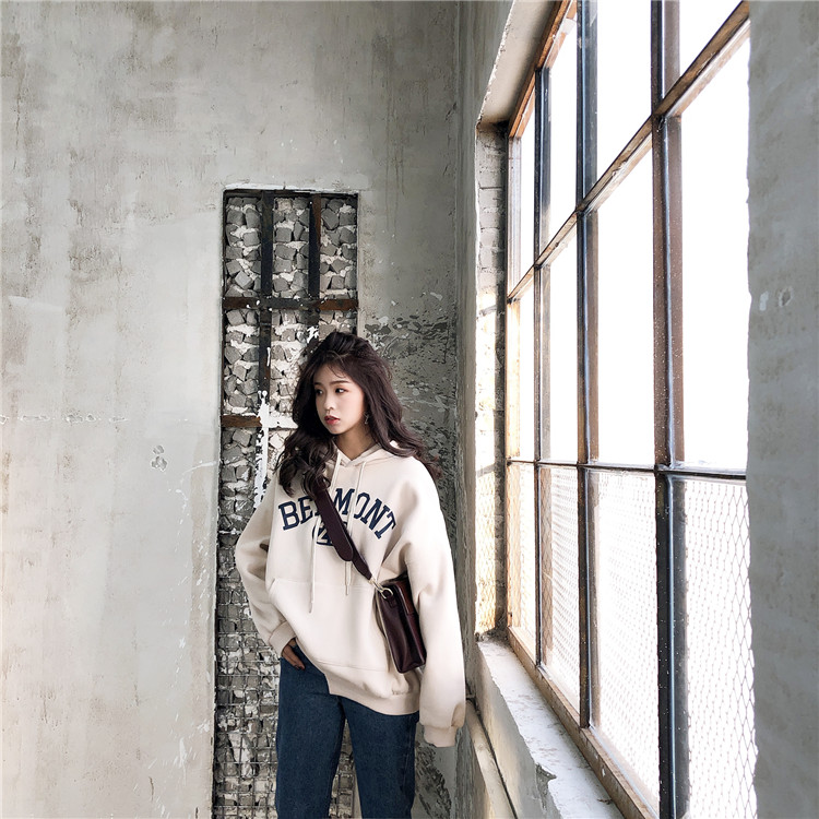 / 港味復古新款百搭顯瘦百搭BF風寬松印花下擺不對稱加絨衛衣上衣女