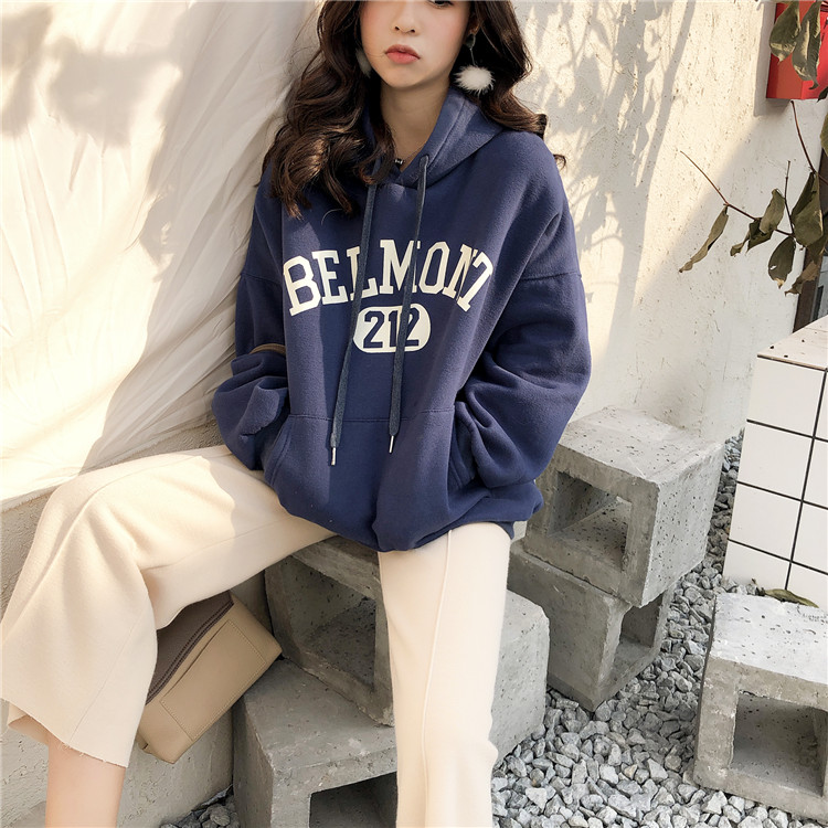 港味復古新款百搭顯瘦百搭BF風寬松印花下擺不對稱加絨衛衣上衣女