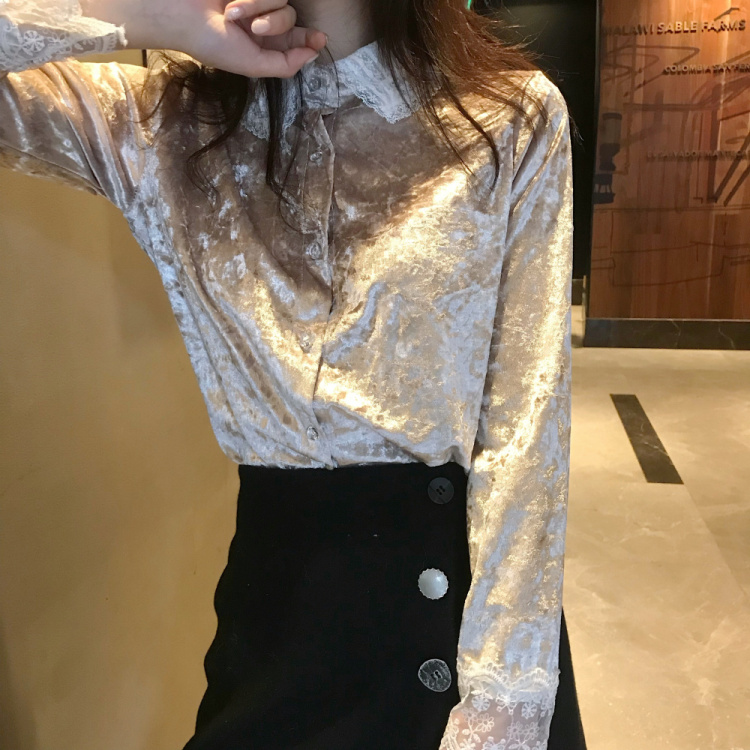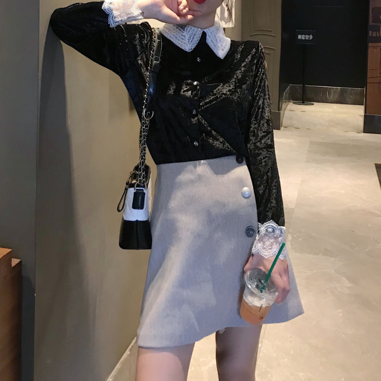 / 新款韓版花邊領襯衫上衣修身顯瘦排扣短款A字裙高腰半裙時尚套裝
