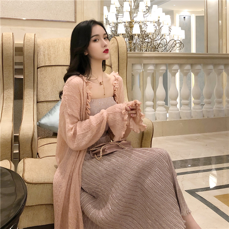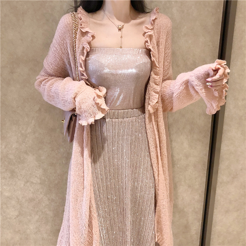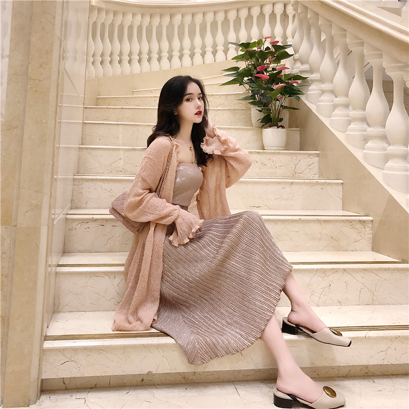 2018秋裝新款韓版針織開衫blingbling抹胸上衣高腰百褶半身裙套裝