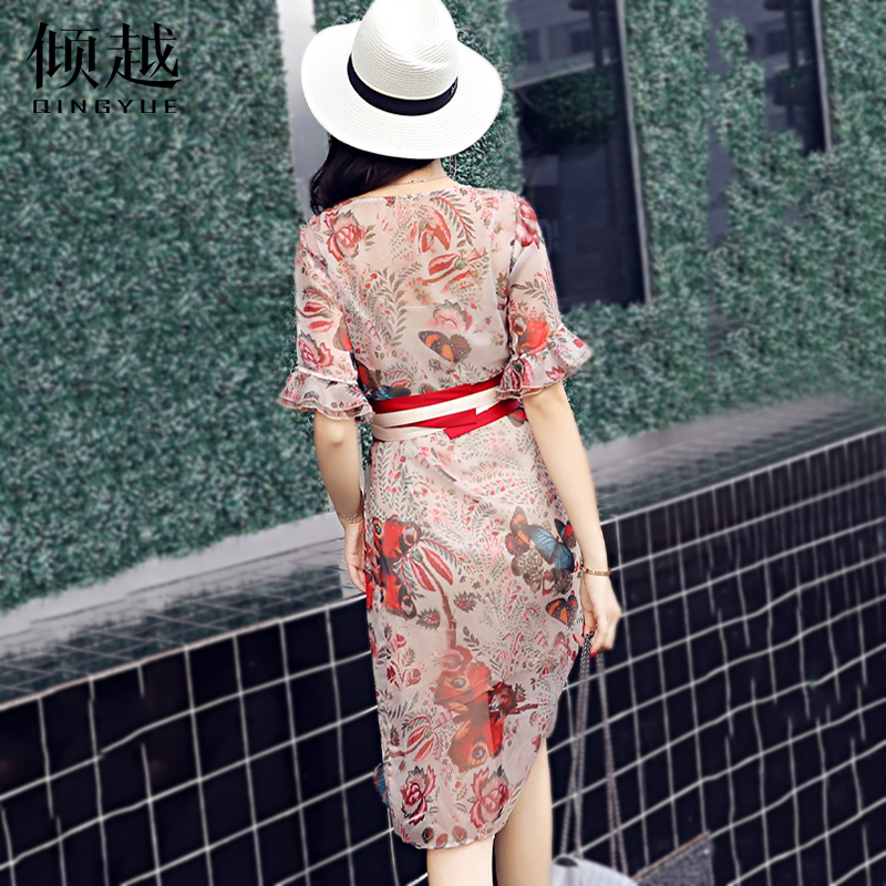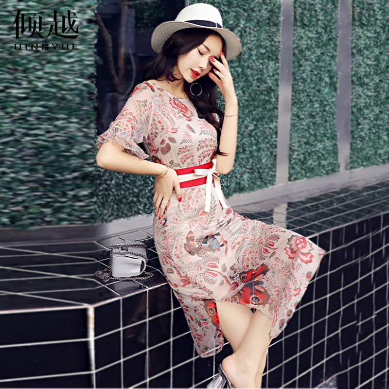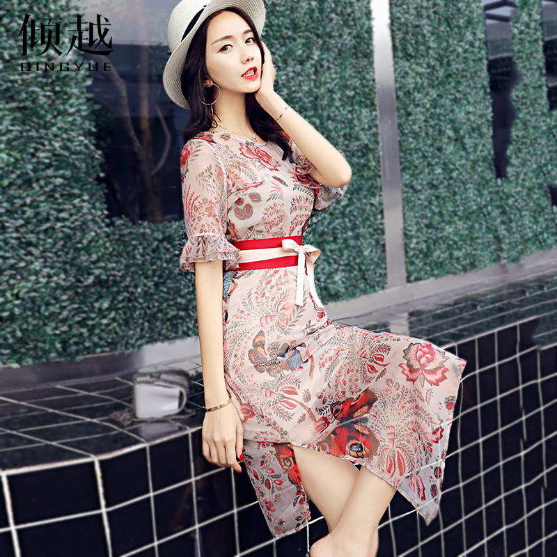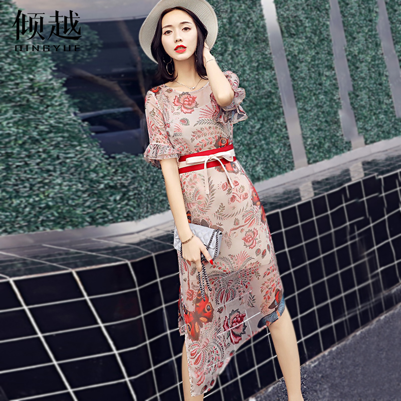 / 2017夏季新款印花顯瘦通勤修身包臀裙女改良旗袍中長款雪紡連衣裙