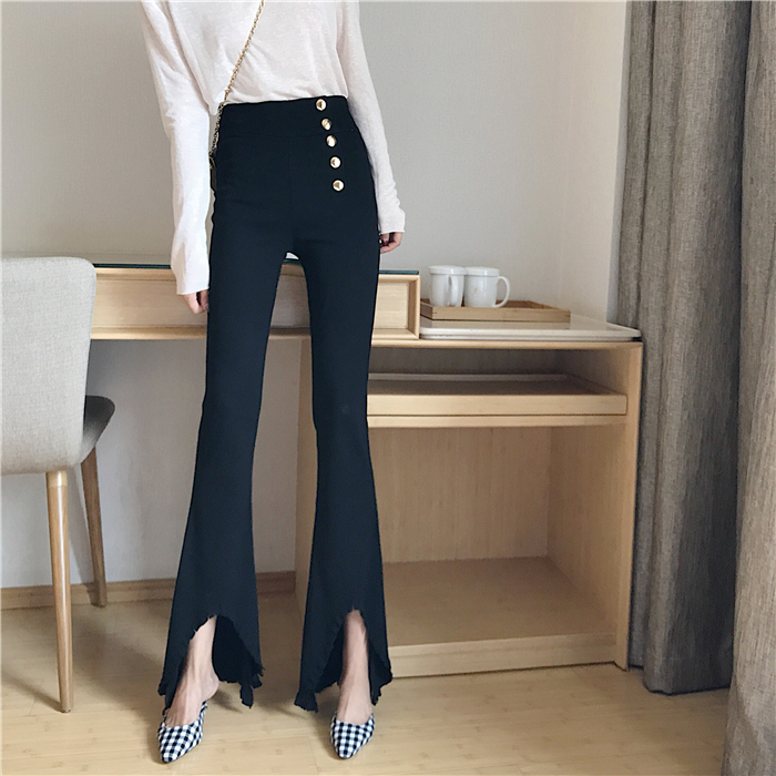 / 2018秋新款開叉流蘇時尚設計感褲子女氣質高腰彈力百搭修身喇叭褲