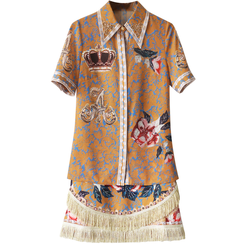 S秀氣質印花上衣釘珠套裝女夏2018新款高腰半裙時尚名媛兩件套潮