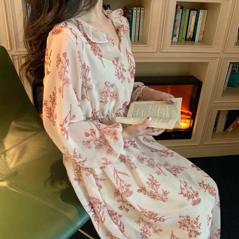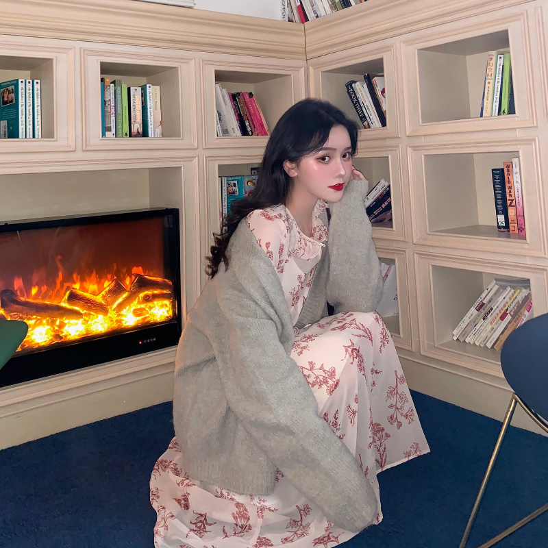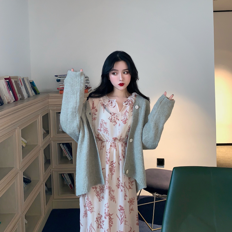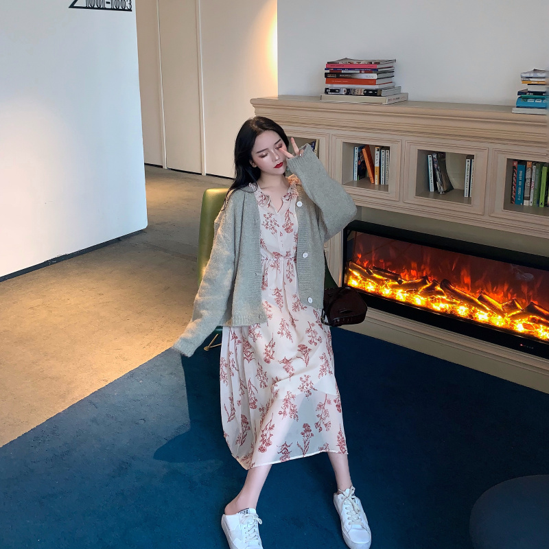 慵懶風v領短款針織開衫女+碎花長袖連衣裙女顯瘦chic雪紡長裙