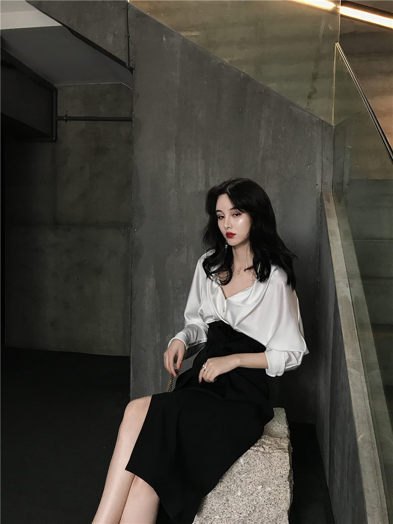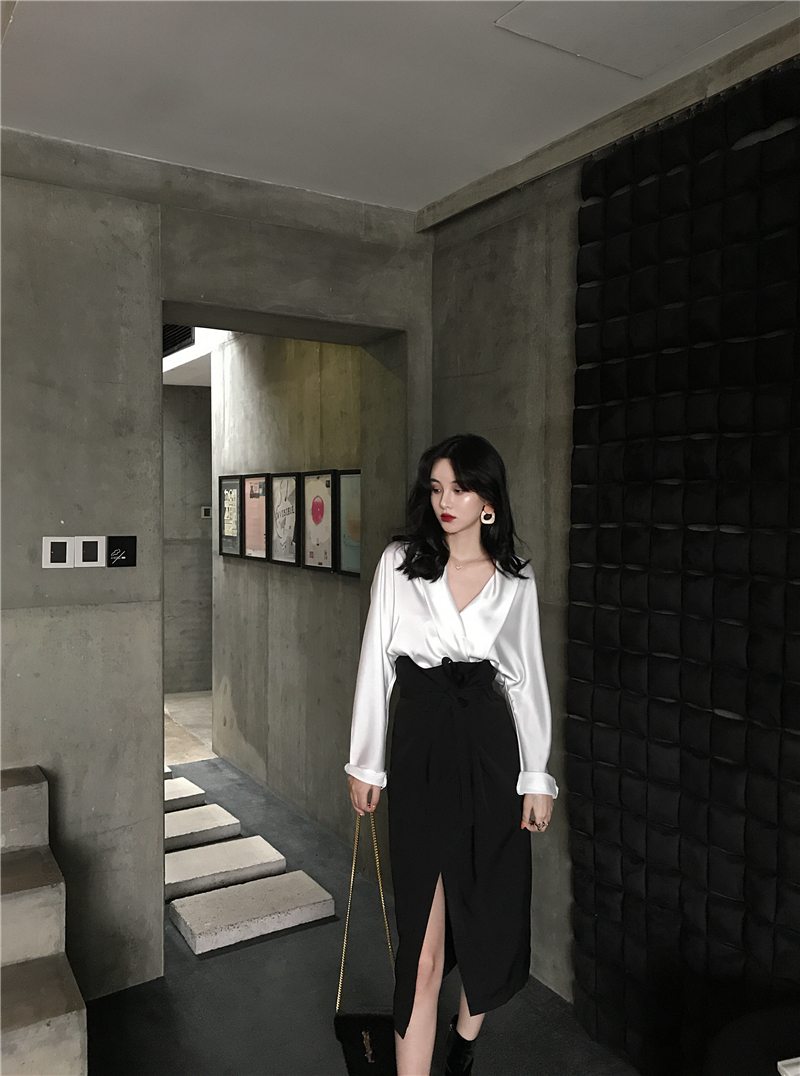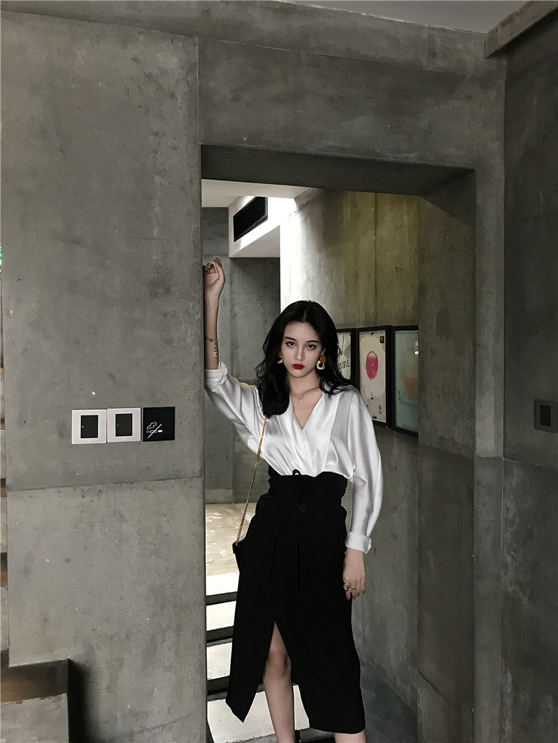 新款性感大v領襯衣復古OL風中長款高腰開叉半身裙兩件套時尚套裝