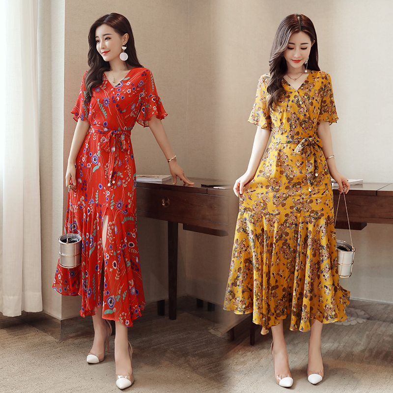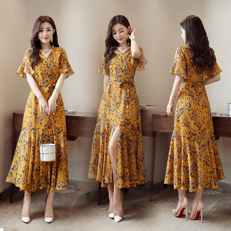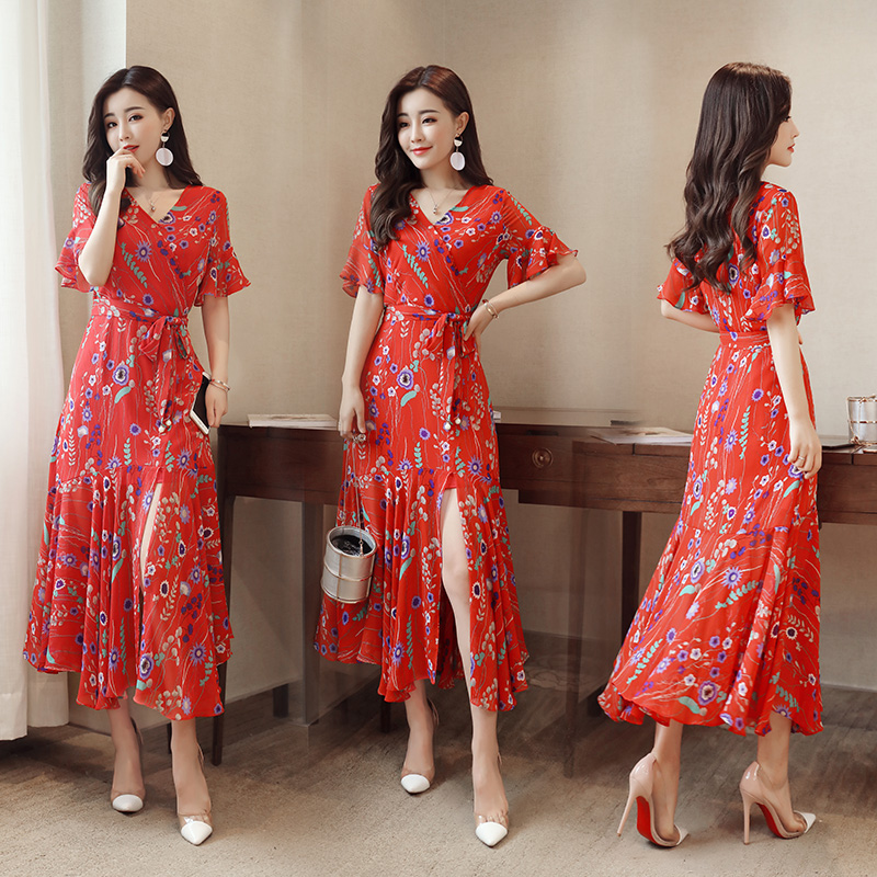碎花雪紡連衣裙女夏2017新款韓版喇叭袖名媛氣質顯瘦波西米亞長裙