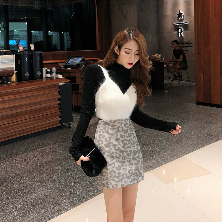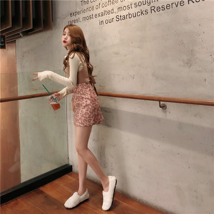 / 新款韓版百搭針織打底衫顯瘦氣質小吊帶毛呢豹紋半身裙時尚套裝女