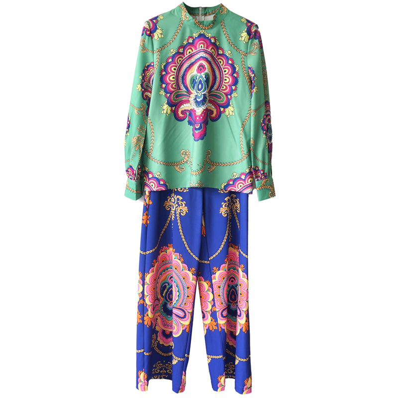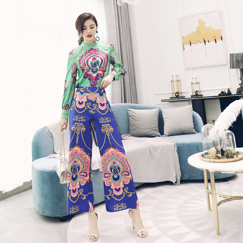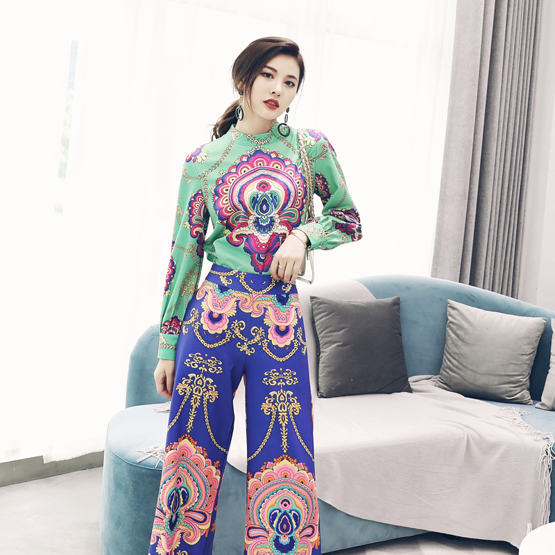 時尚秋裝套裝2018夏新款腰帶顯瘦復古闊腿褲港味印花網紅兩件套潮