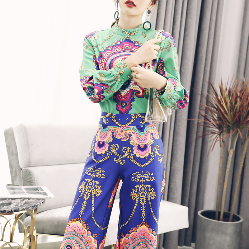 / 時尚秋裝套裝2018夏新款腰帶顯瘦復古闊腿褲港味印花網紅兩件套潮