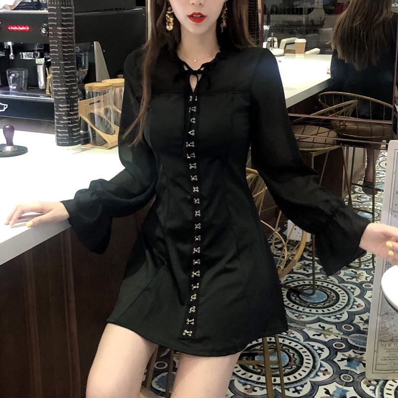 晚晚風新款修身顯瘦2018秋裝雪紡名媛連衣裙小黑裙復古裙初戀裙子