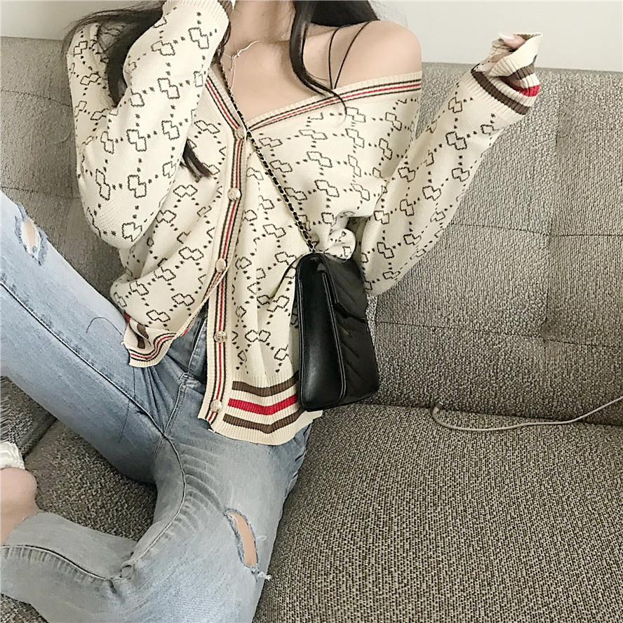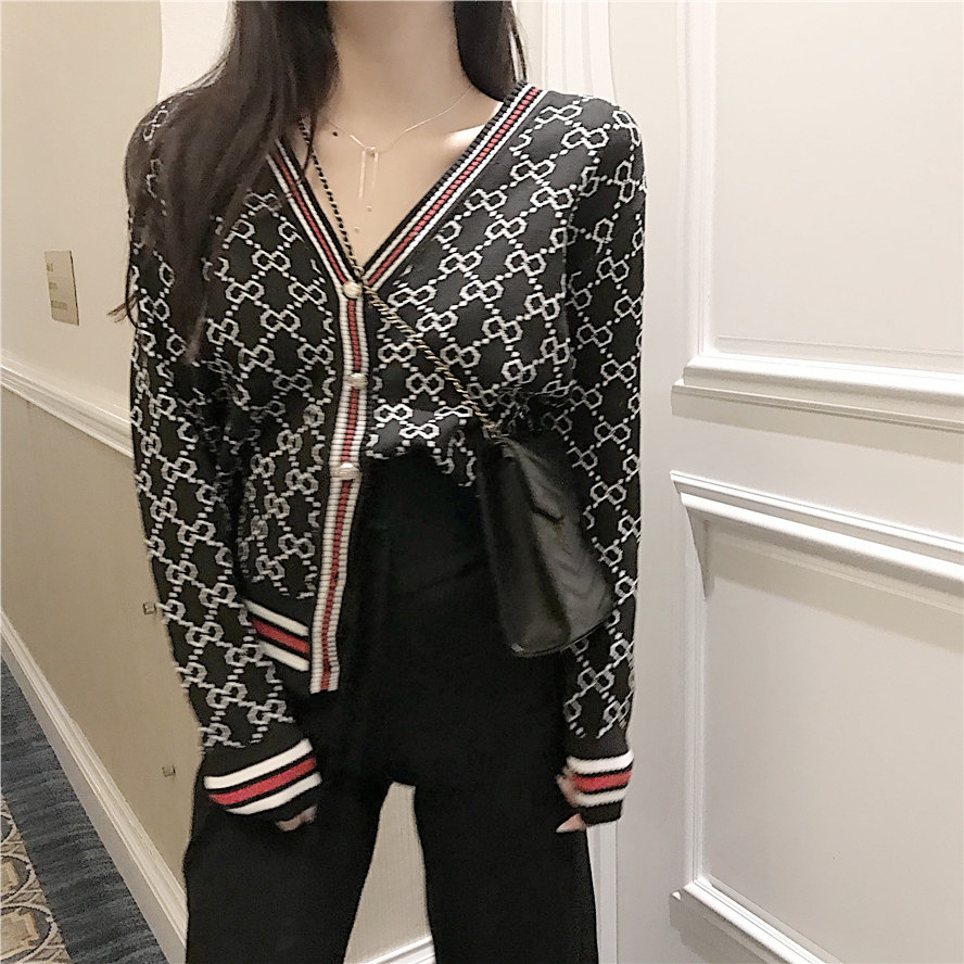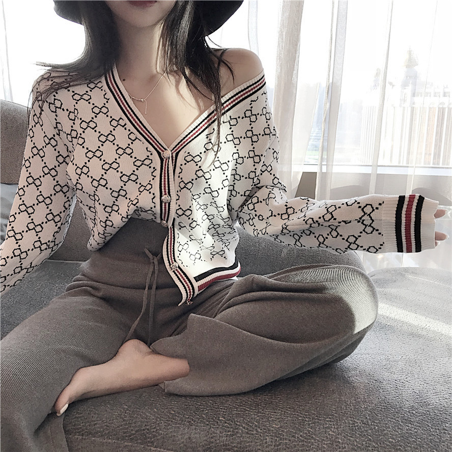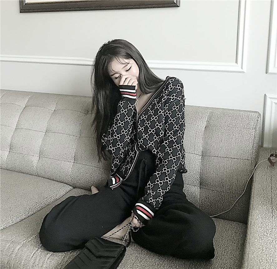 / 秋裝新款時尚套裝撞色提花V領開衫小外套高腰系繩休閑褲兩件套女