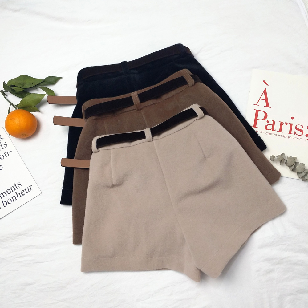 港味復古新款chic時尚秋冬百搭毛絨闊褲腿高腰裙褲短褲女潮送腰帶