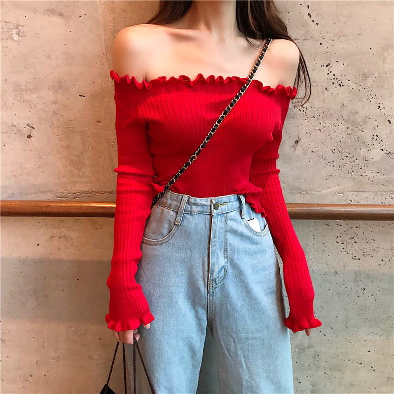 / 2018新款港風秋季韓風一字露肩木耳邊長袖針織衫修身短款打底上衣