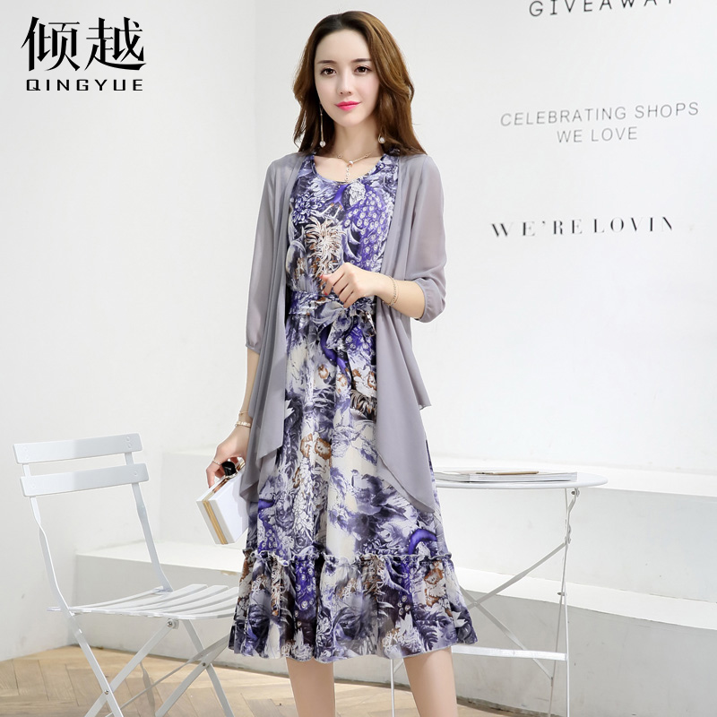 傾越2017春裝新款兩件套連衣裙印花中長裙雪紡套裙波西米亞長裙夏