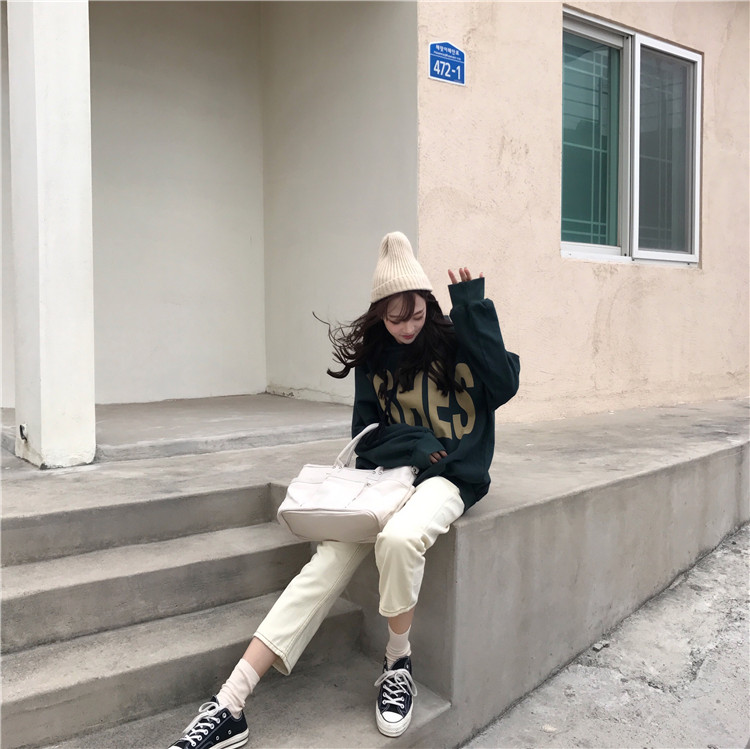 秋裝女裝韓版原宿風大字母寬松加絨抽繩長袖連帽套頭衛衣上衣外套
