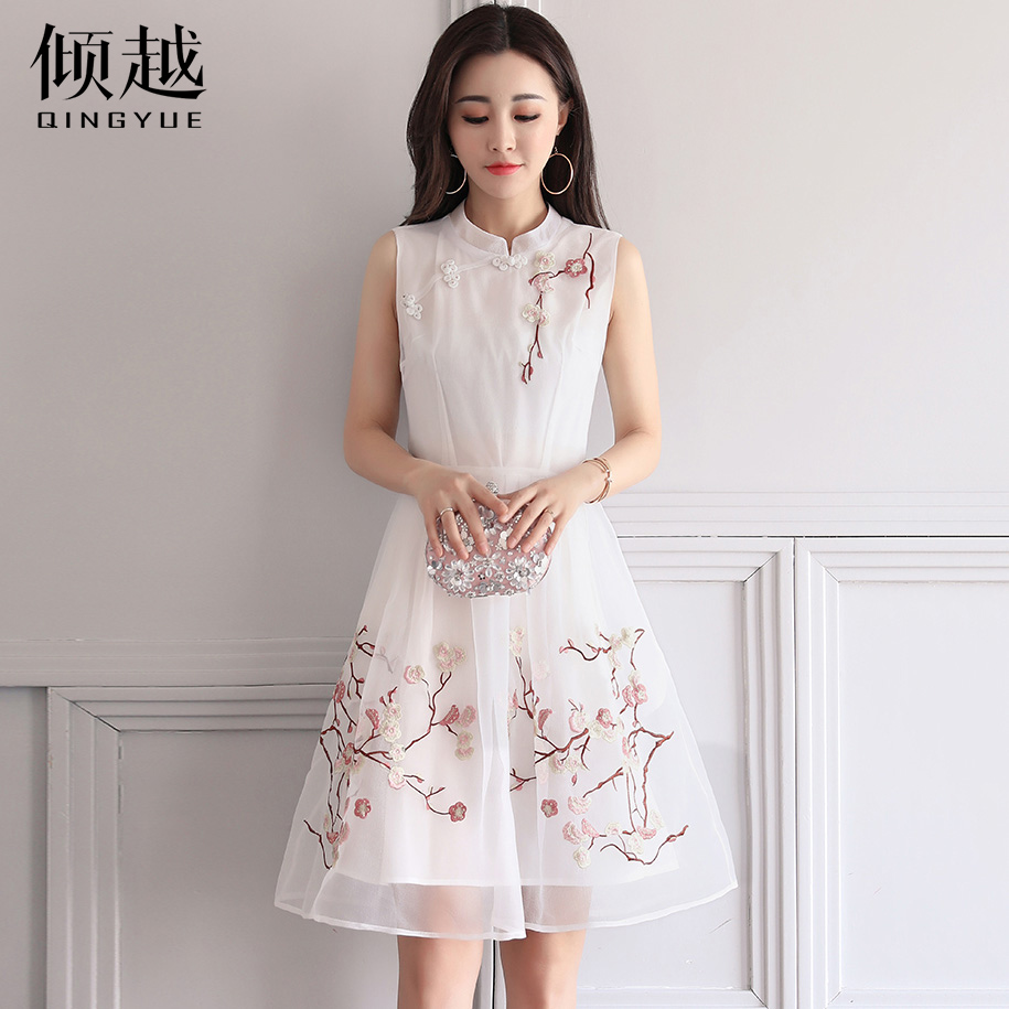 / 2017夏裝韓版新款女裝修身氣質歐根紗刺繡復古中長款無袖連衣裙潮