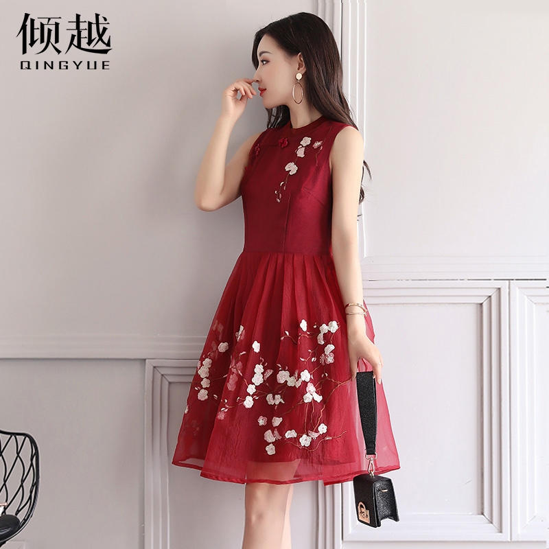 2017夏裝韓版新款女裝修身氣質歐根紗刺繡復古中長款無袖連衣裙潮