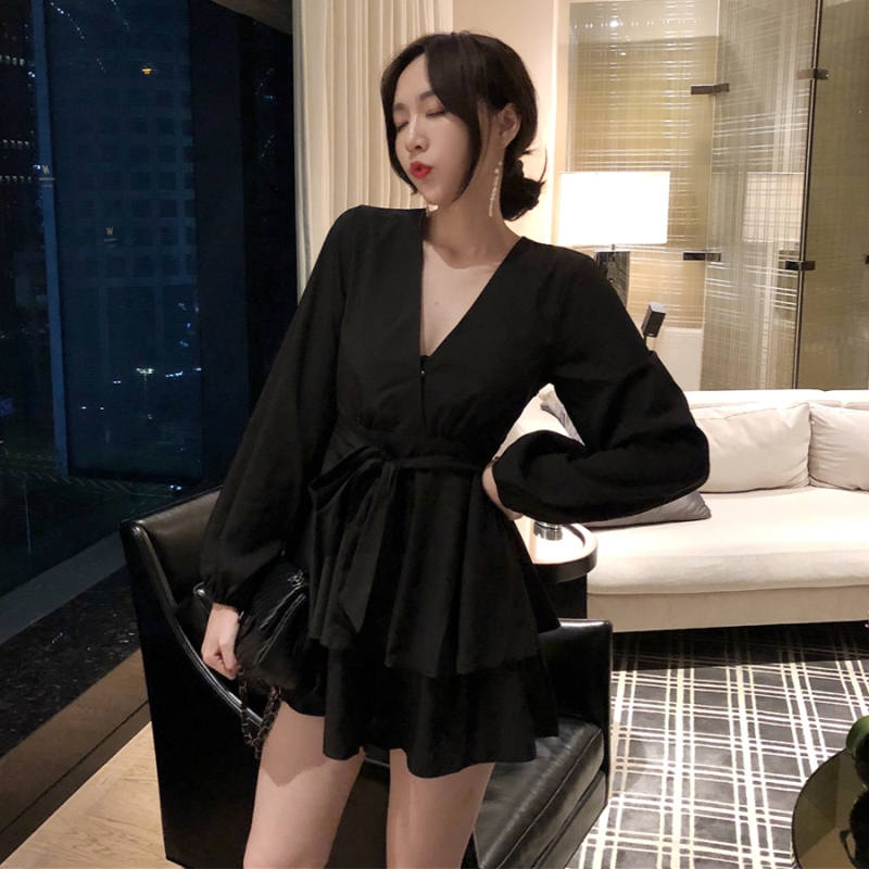 / 晚晚風2018新款秋裝寬松顯瘦高腰V領長袖綁帶連衣裙潮A字短褲裙女