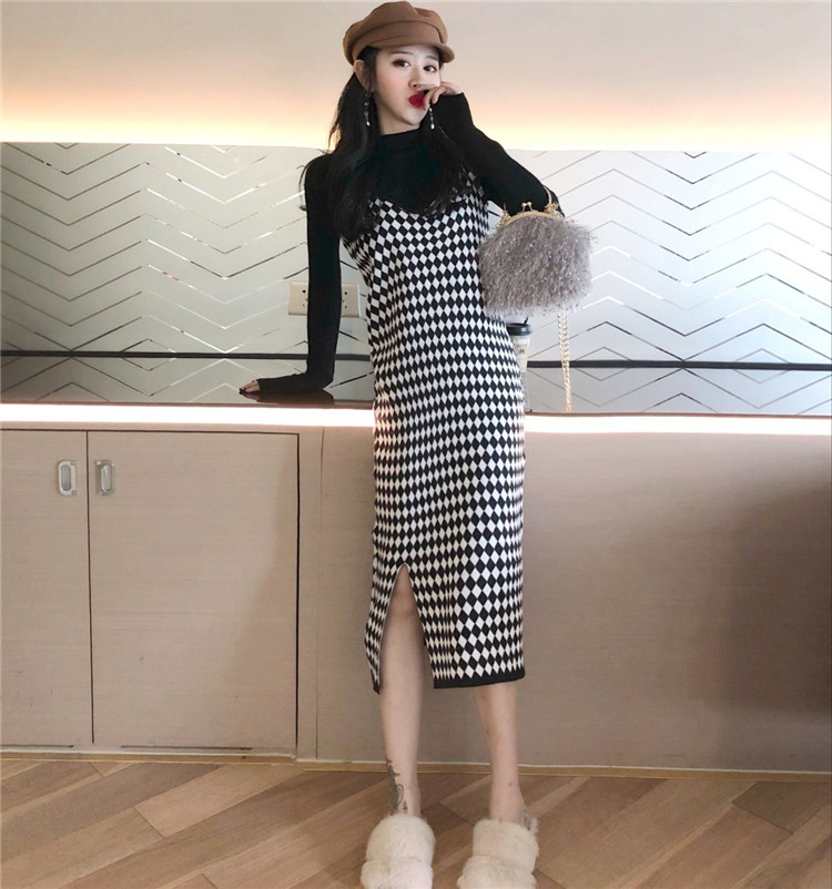 套裝女秋韓版氣質修身顯瘦半高領打底衫開叉格子吊帶長裙兩件套潮