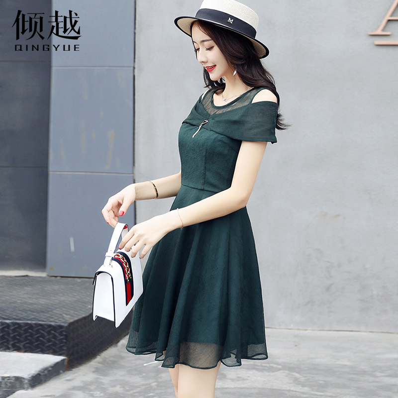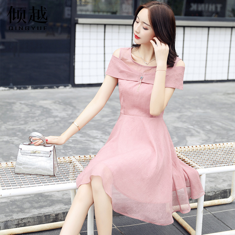 / 2017新款夏季雪紡連衣裙女中長款漏肩收腰顯瘦裙子時尚修身A字裙