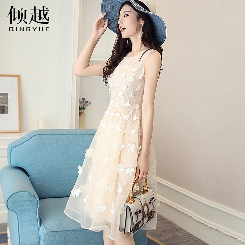 2017夏季新款甜美氣質淑女中長款蕾絲刺繡無袖顯瘦歐根紗連衣裙仙