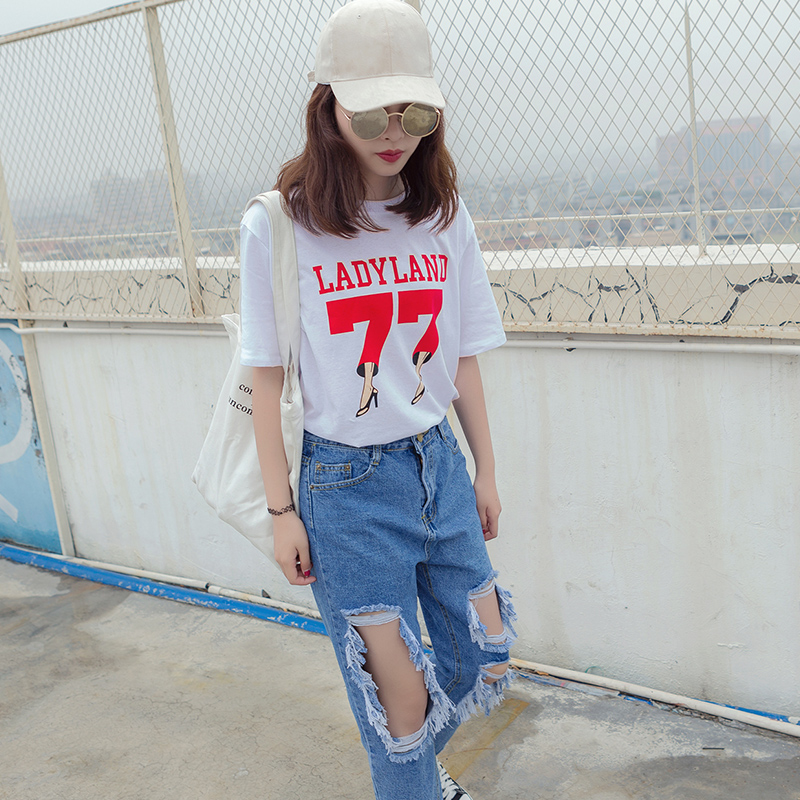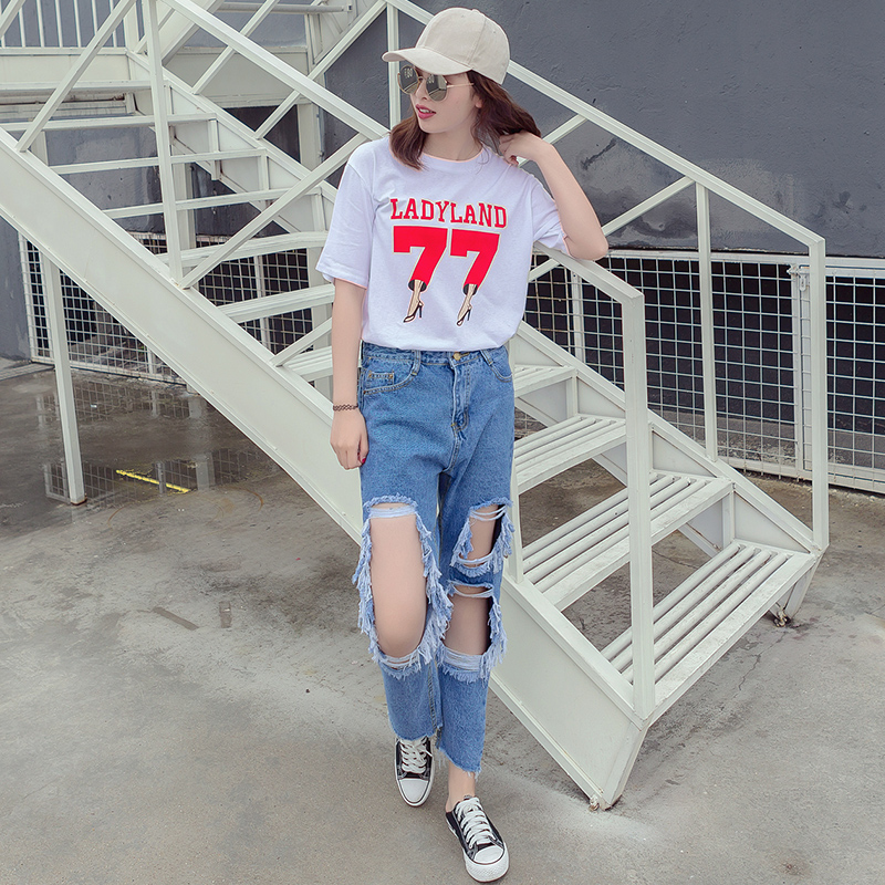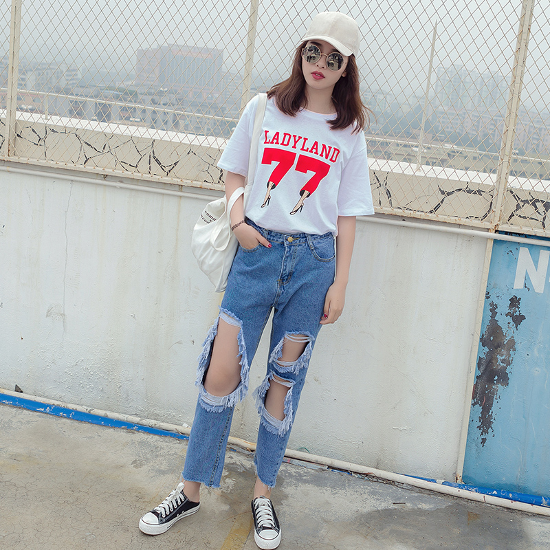 / 春夏季韓版純色毛邊破洞牛仔褲女寬松九分褲顯瘦褲子潮學生