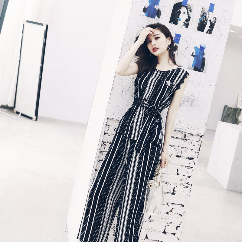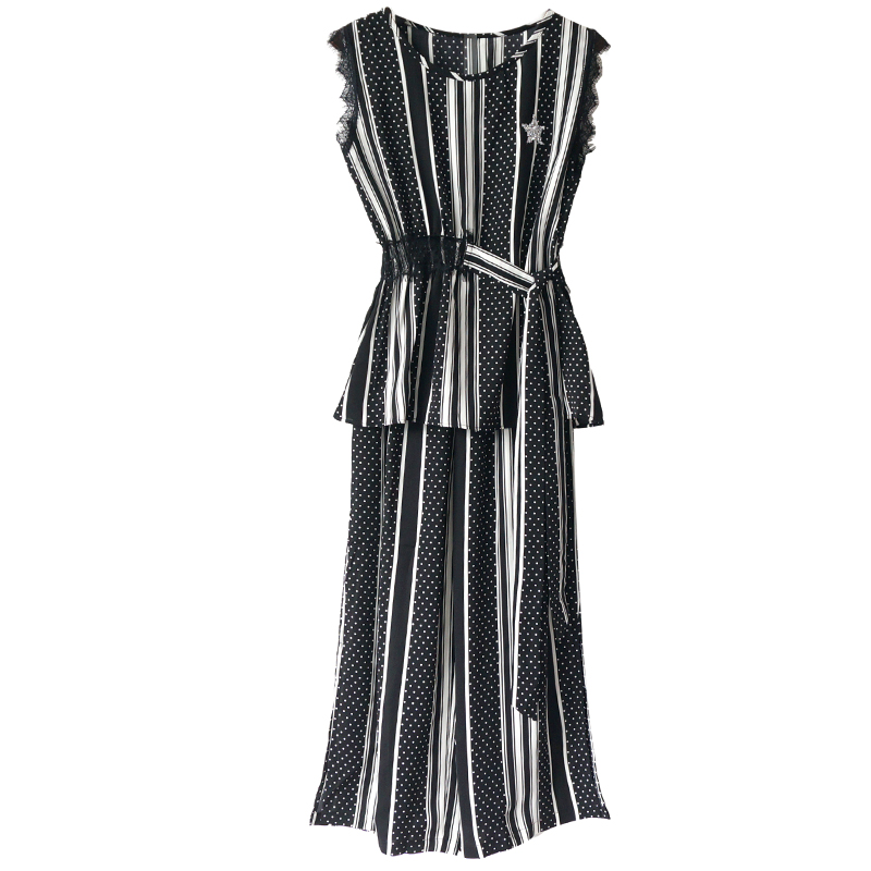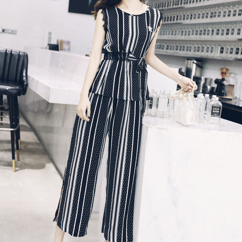 2018新款開叉闊腿褲套裝女夏季印花收腰上衣休閑時尚氣質兩件套潮