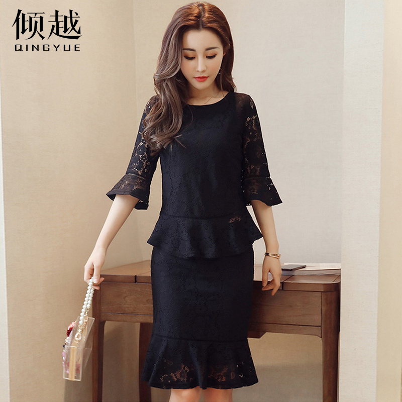 傾越2017春夏裝新款女套裝裙蕾絲長袖包臀魚尾裙修身兩件套連衣裙