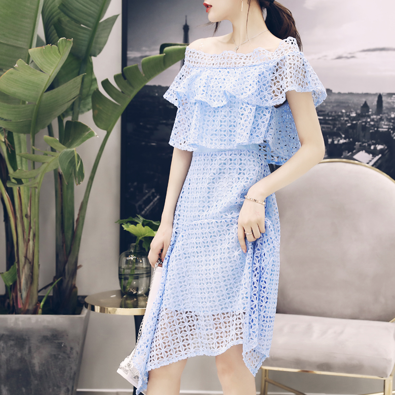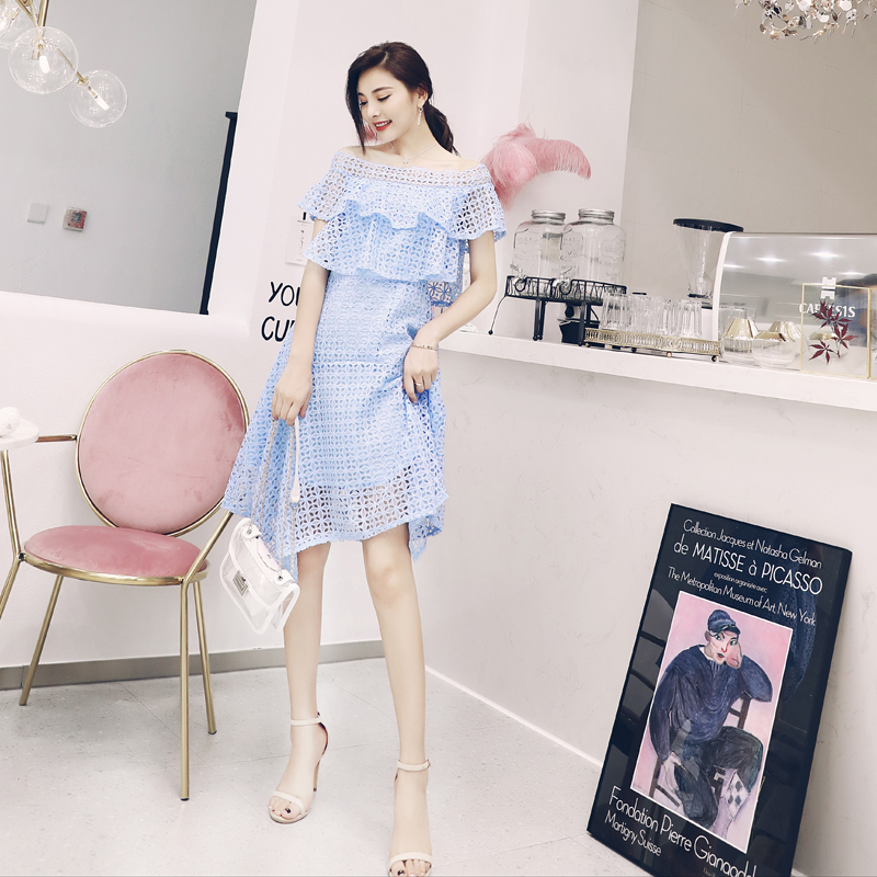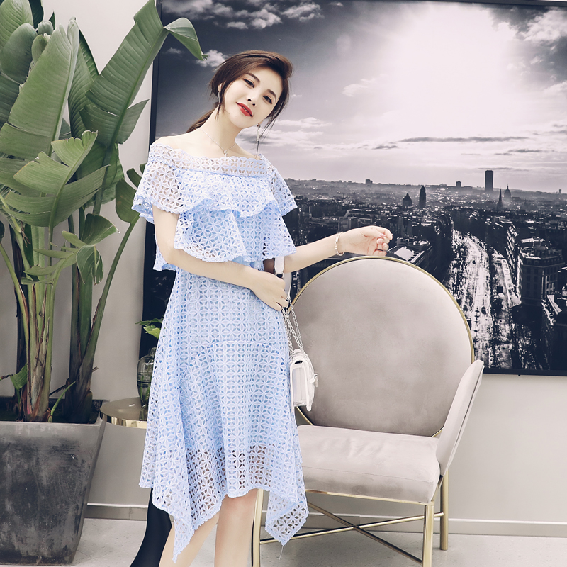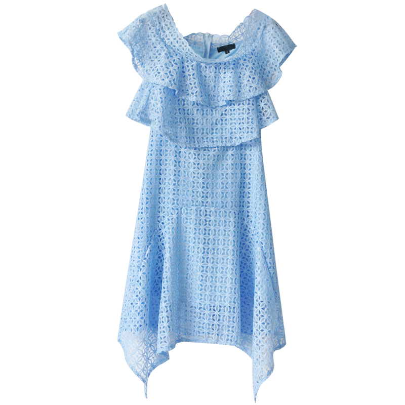 2018新款裙藍水溶蕾絲不規則連衣裙A字裙子少女心超仙初戀裙夏潮