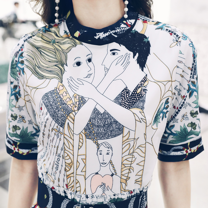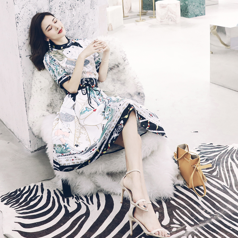 / 名媛修身印花收腰綁帶連衣裙女中長款夏裝新款2018超仙女神范中