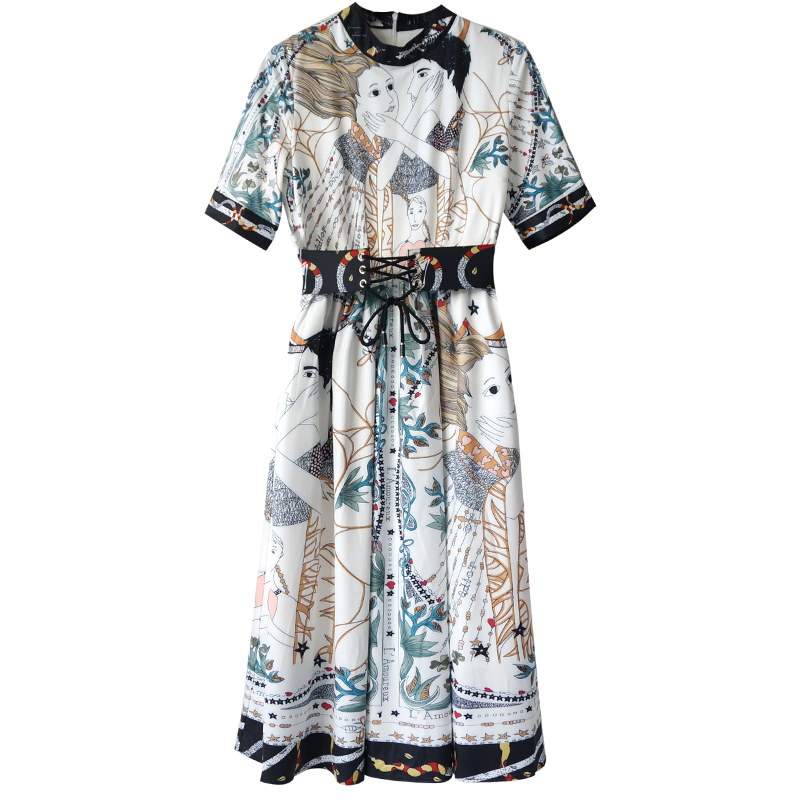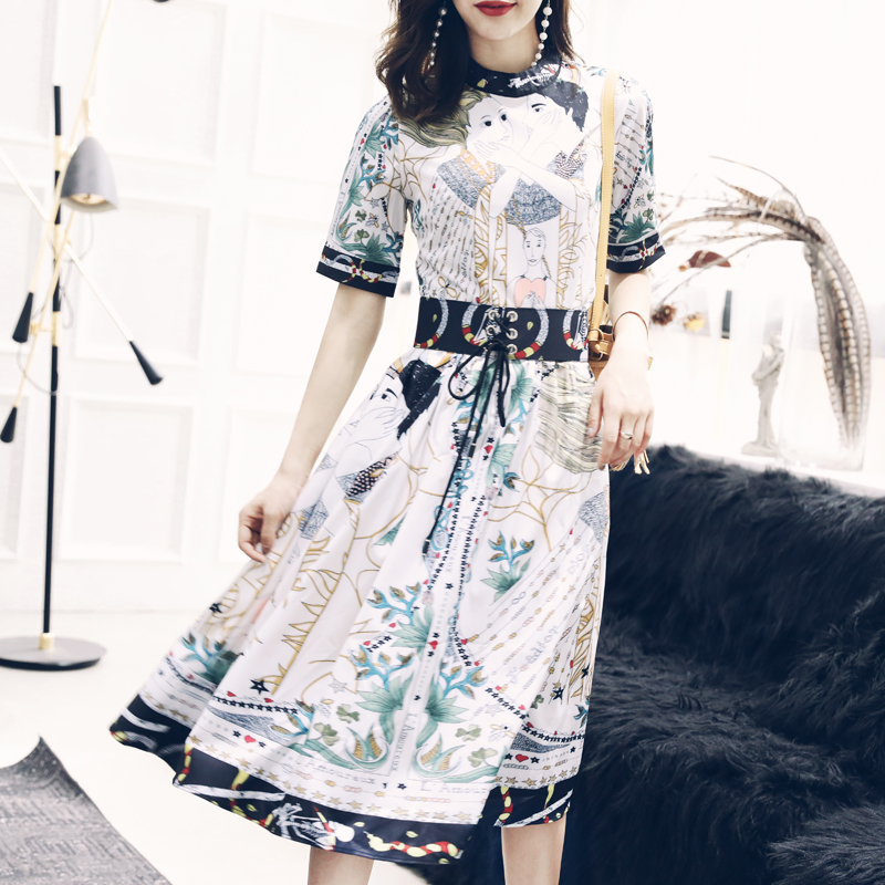 名媛修身印花收腰綁帶連衣裙女中長款夏裝新款2018超仙女神范中