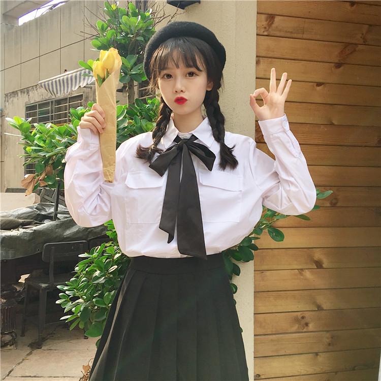 / 韓版時尚休閑套裝秋季女裝寬松領帶長袖襯衫+百褶裙褲短裙兩件套