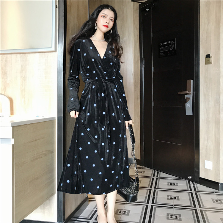 連衣裙秋裝2018新款名媛氣質V領修身顯瘦長款波點長袖高冷范女裝