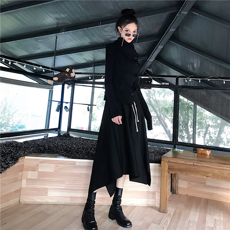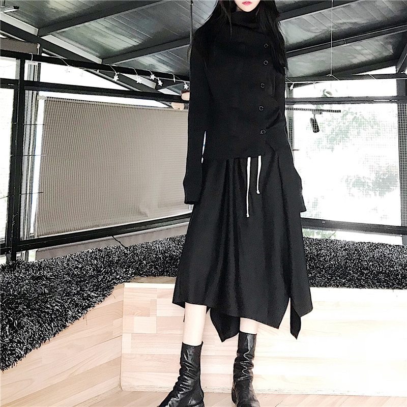 / 新款韓版秋季時尚套裝堆堆領單排扣長袖針織上衣不規則抽繩半身裙
