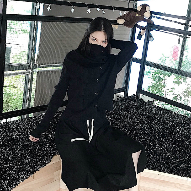 新款韓版秋季時尚套裝堆堆領單排扣長袖針織上衣不規則抽繩半身裙