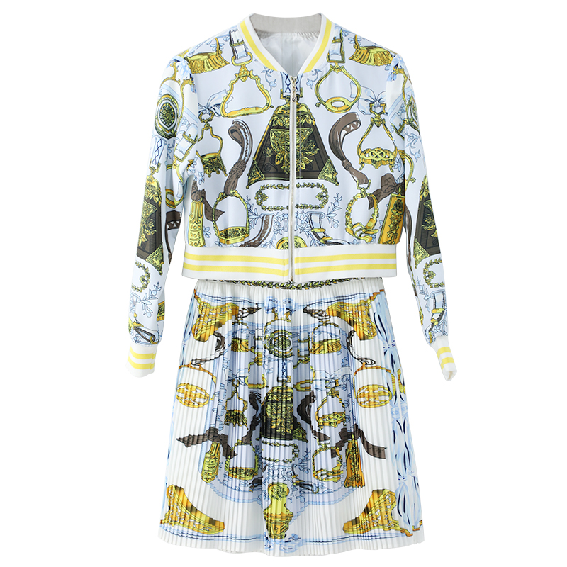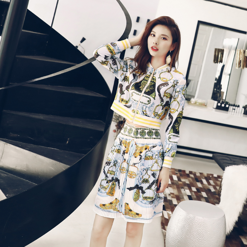 / 2018夏秋裝網紅新款休閑套裝女百褶短裙長袖夾克短上衣外套兩件套