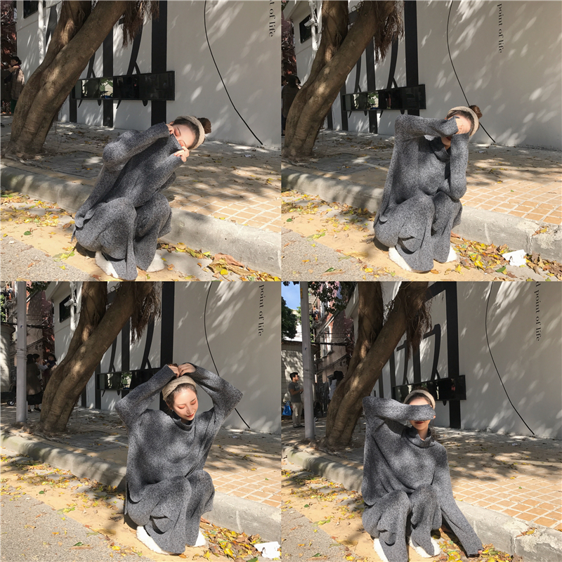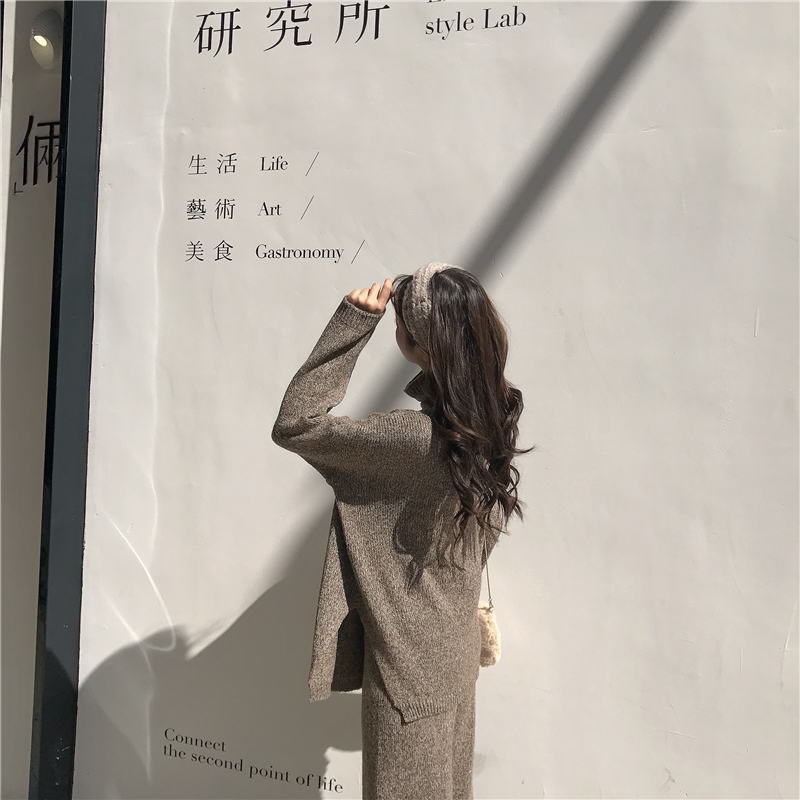 復古慵懶寬松加厚保暖高領毛衣女秋冬新款+高腰顯瘦針織闊腿褲潮