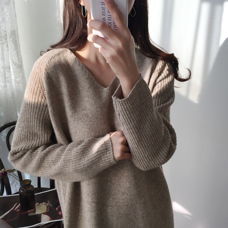 韓國chic秋冬2018新款氣質V領長袖中長款顯瘦毛線連衣裙女毛衣裙