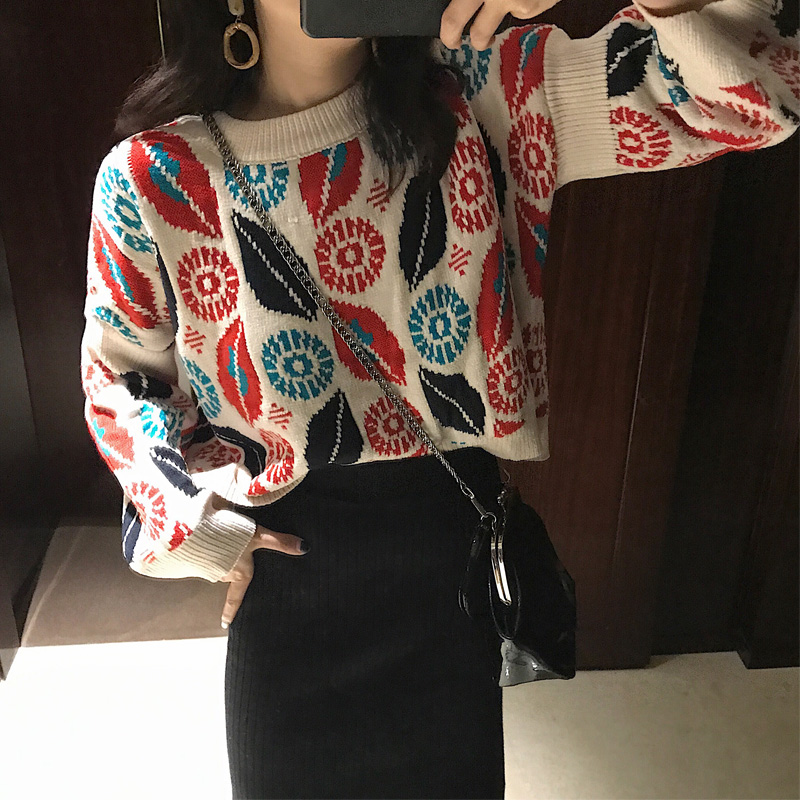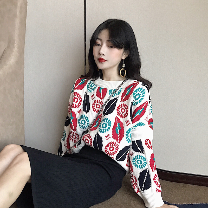 / 港味秋冬寬松慵懶民族風樹葉圖案新款毛衣女長袖套頭圓領chic上衣
