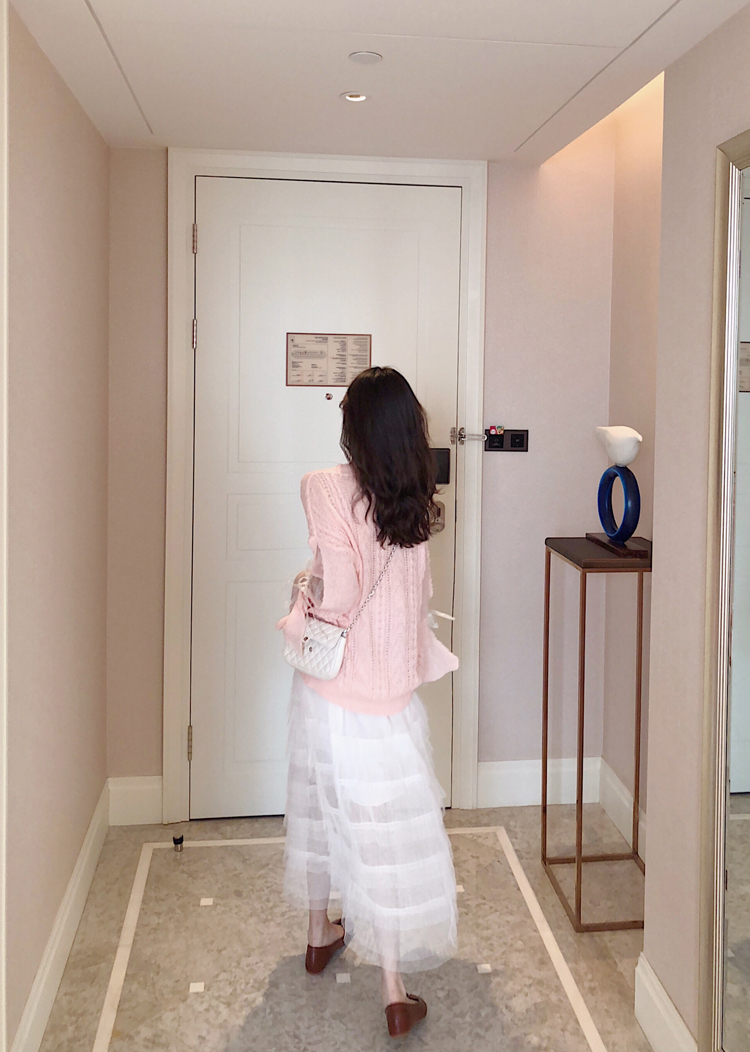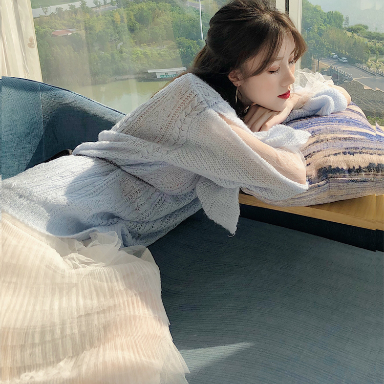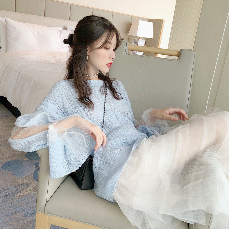 慵懶風拼接網紗系帶長袖圓領針織衫+時尚chic仙女氣質網紗蛋糕裙