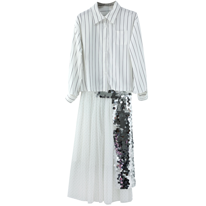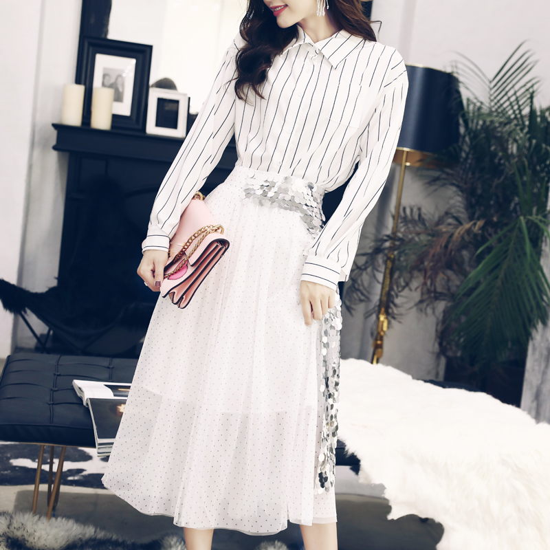名媛氣質韓版豎條紋長袖襯衫亮片網紗半身裙兩件女秋收腰修身套裝